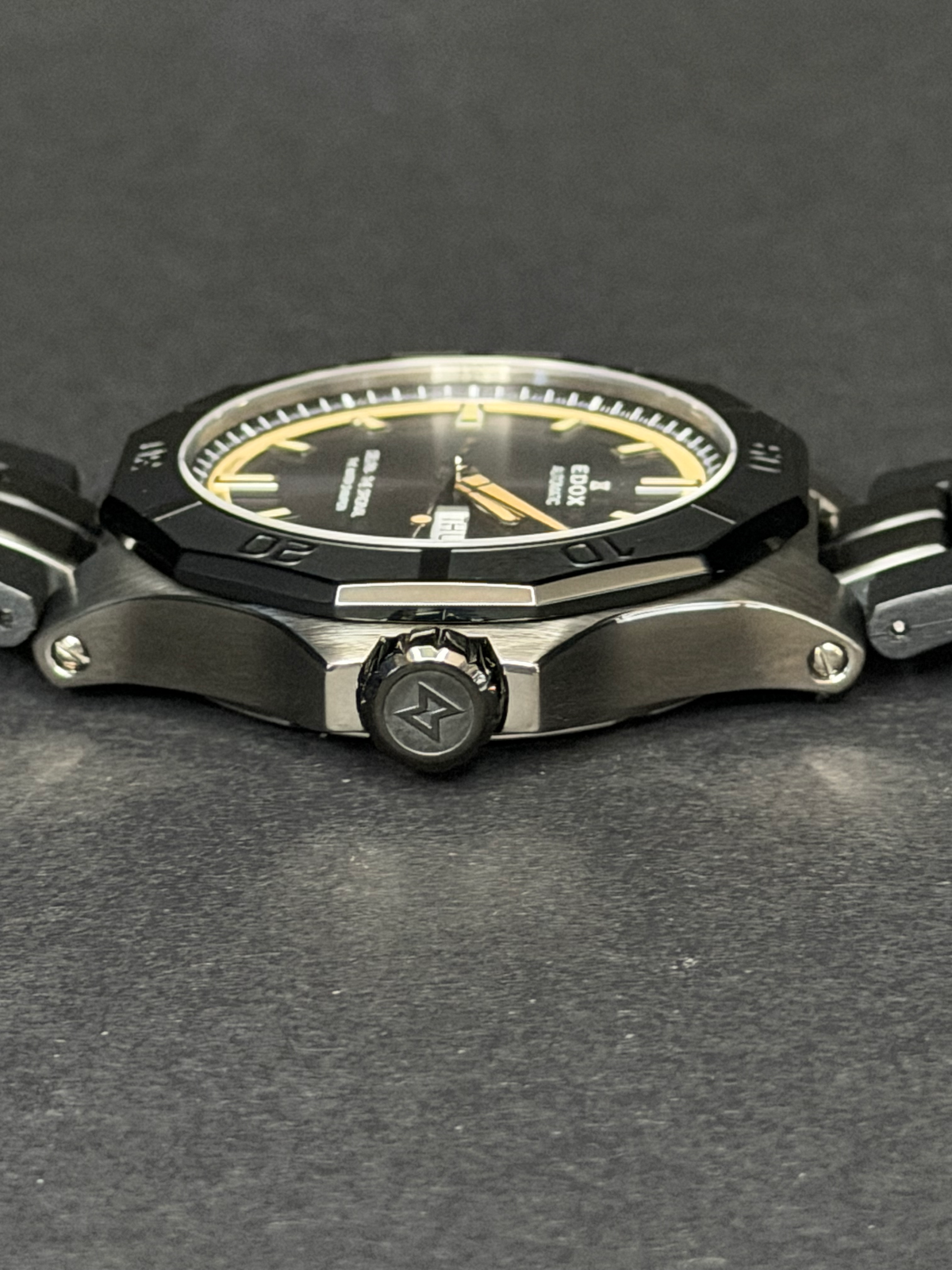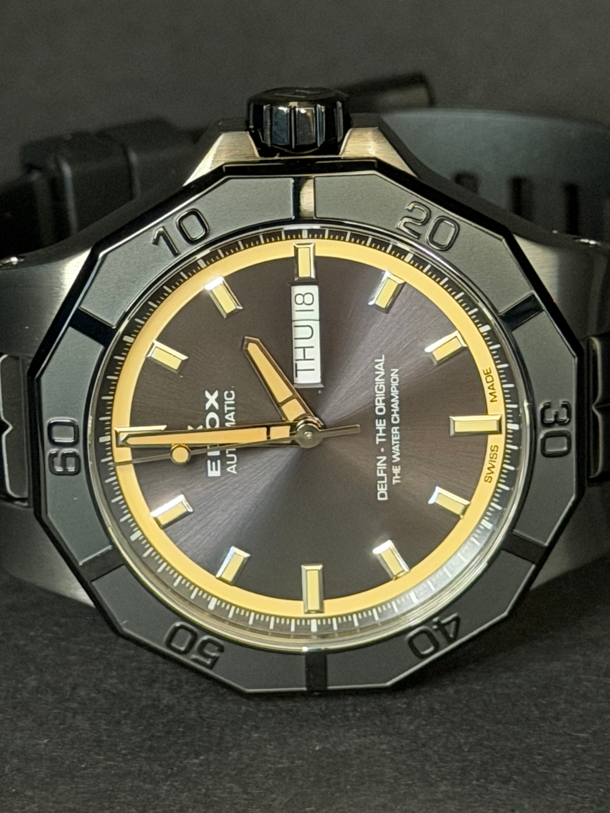 Die Edox Delfin Day-Date 88008-37GNCA-GBEI vereint sportliche Präsenz mit klassischer Schweizer Uhrmacherkunst. Mit ihrem markanten 43-mm-Edelstahlgehäuse, dem grauen Zifferblatt und der kraftvollen Linienführung steht sie für die charakteristische Robustheit der legendären Delfin-Kollektion.