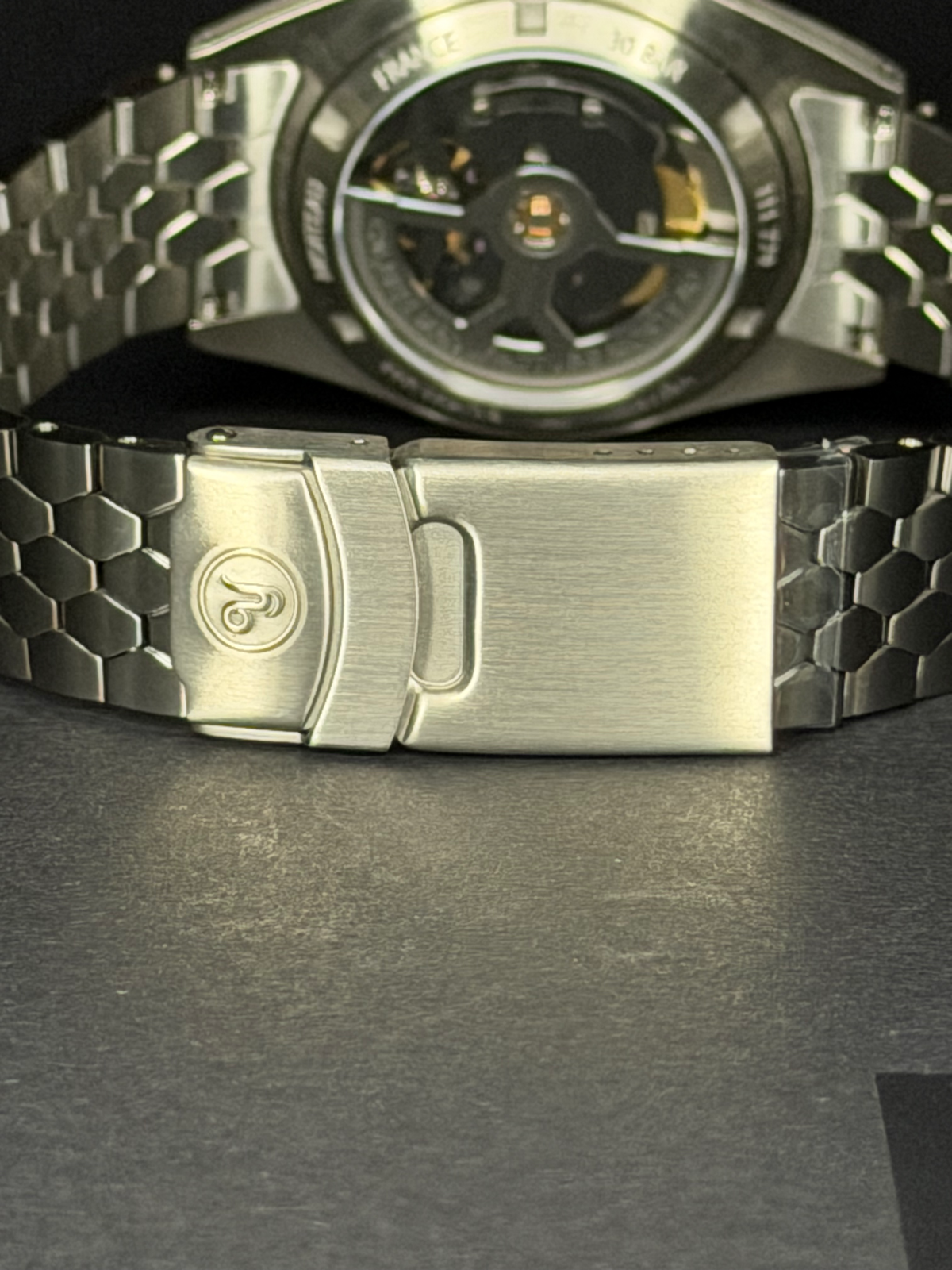 Die Uhr ist mit einem Titanarmband ausgestattet und verfügt über eine Faltschließe mit Sicherheitsverriegelung und Taucherverlängerung. Die verschraubte Krone trägt das Yema-Logo.