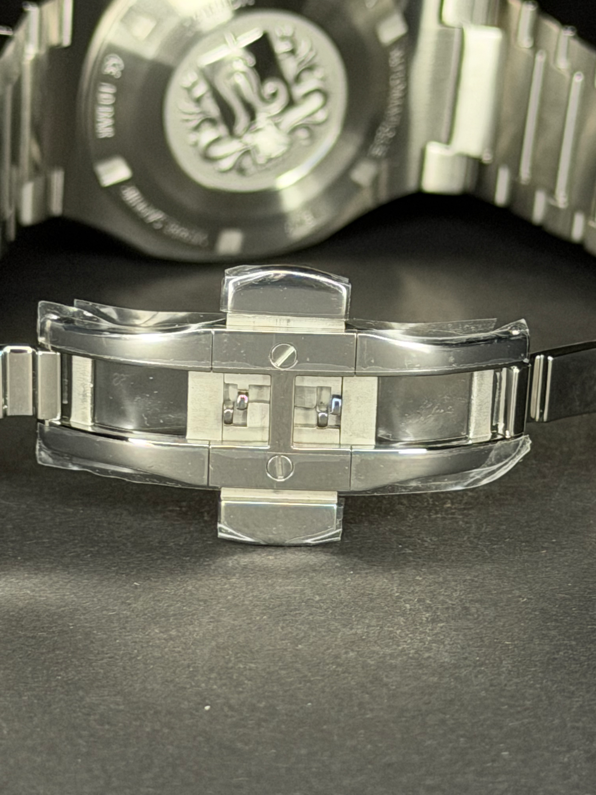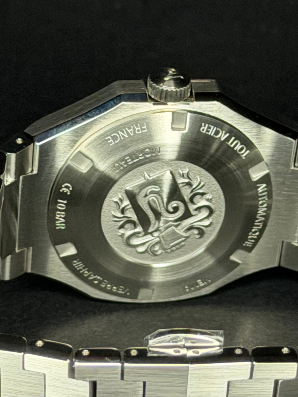 Geschützt wird das Zifferblatt durch ein doppelt gewölbtes Saphirglas, das für hohe Kratzfestigkeit und eine klare Ablesbarkeit sorgt.